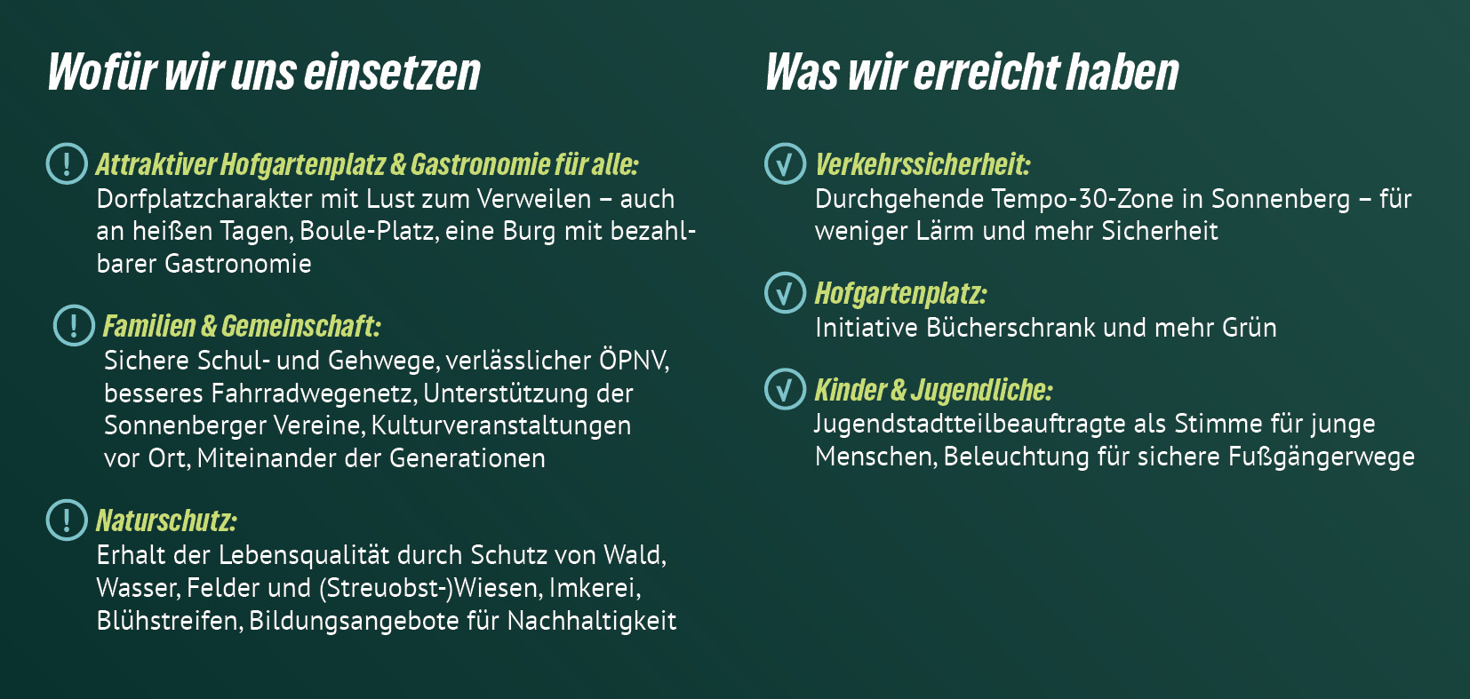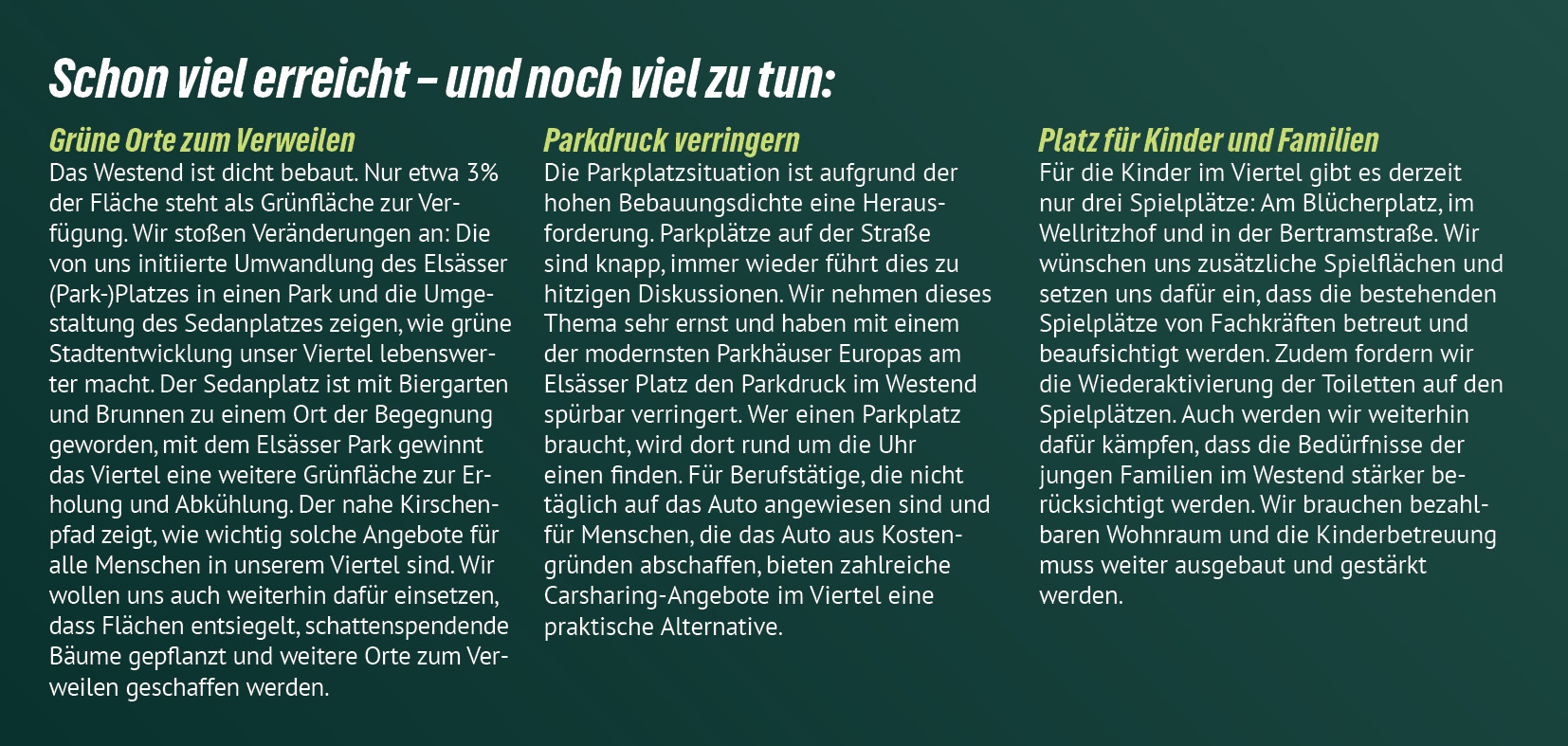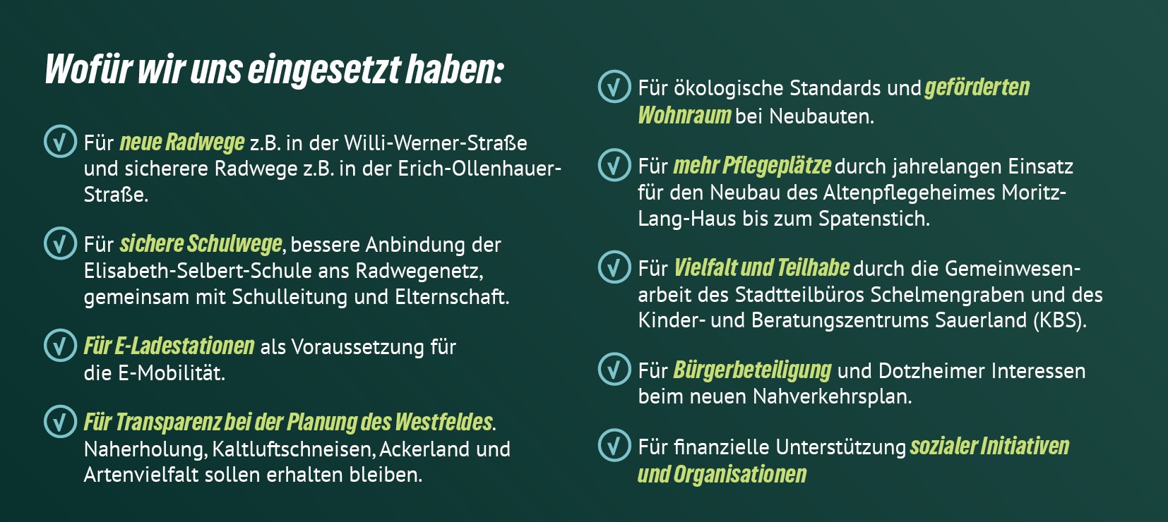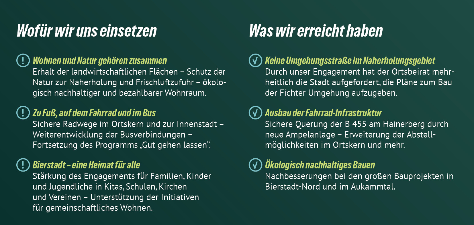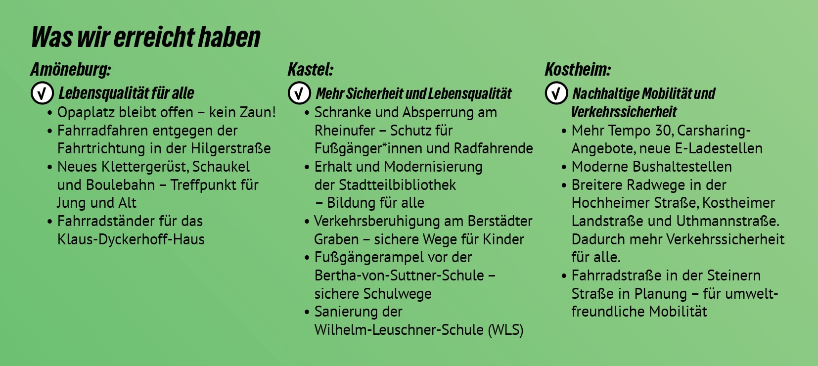 Wir GRÜNE stehen für eine nachhaltige, gerechte und lebenswerte Zukunft in unseren Ortsbezirken. Mit deiner Stimme für unsere Kandidat*innen unterstützt du Menschen, die sich für klimafreundliche Mobilität, mehr Grünflächen, bezahlbaren Wohnraum, ein gutes Miteinander und eine lebenswerte Umgebung in deinem Ortsbezirk einsetzen.