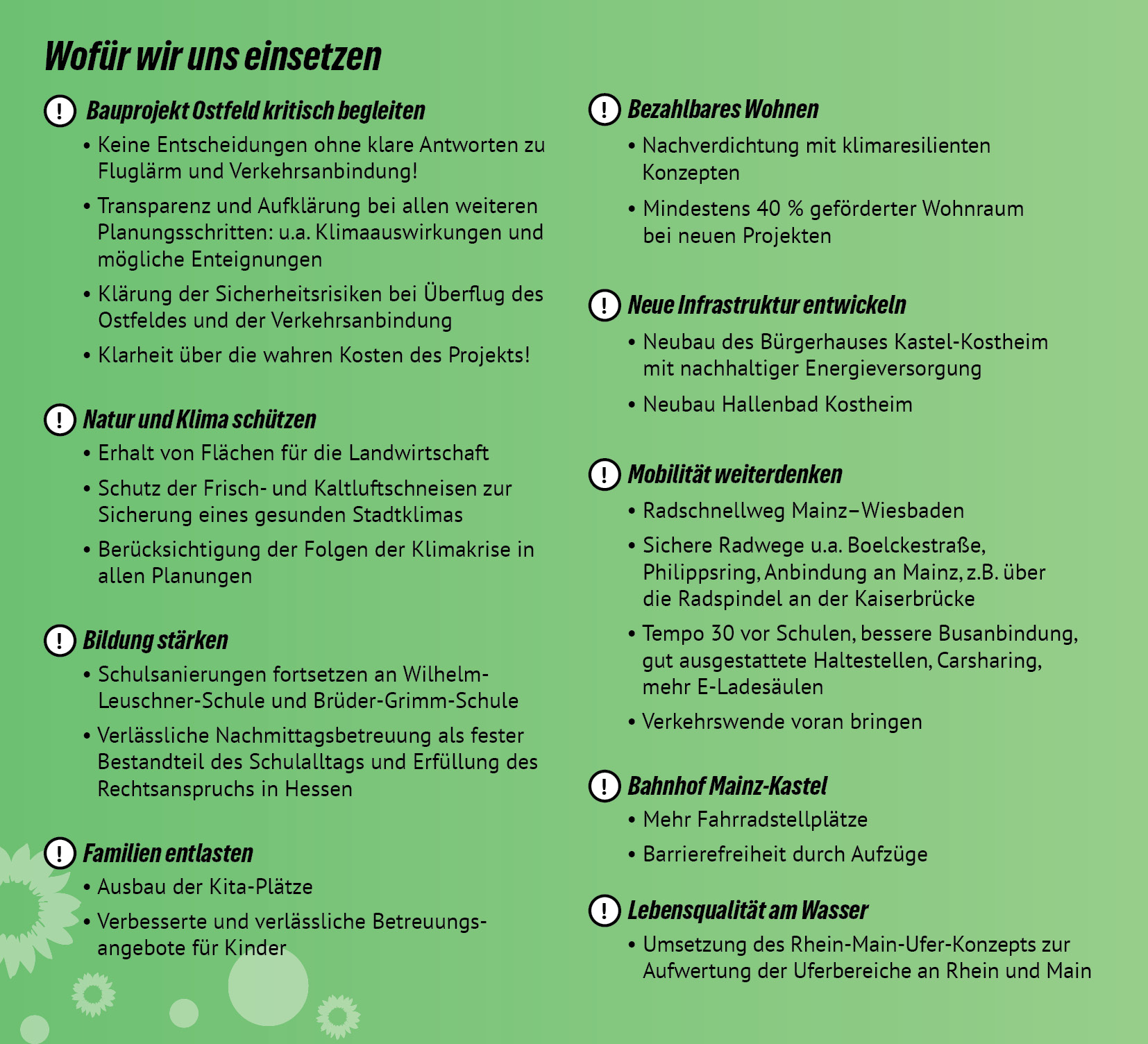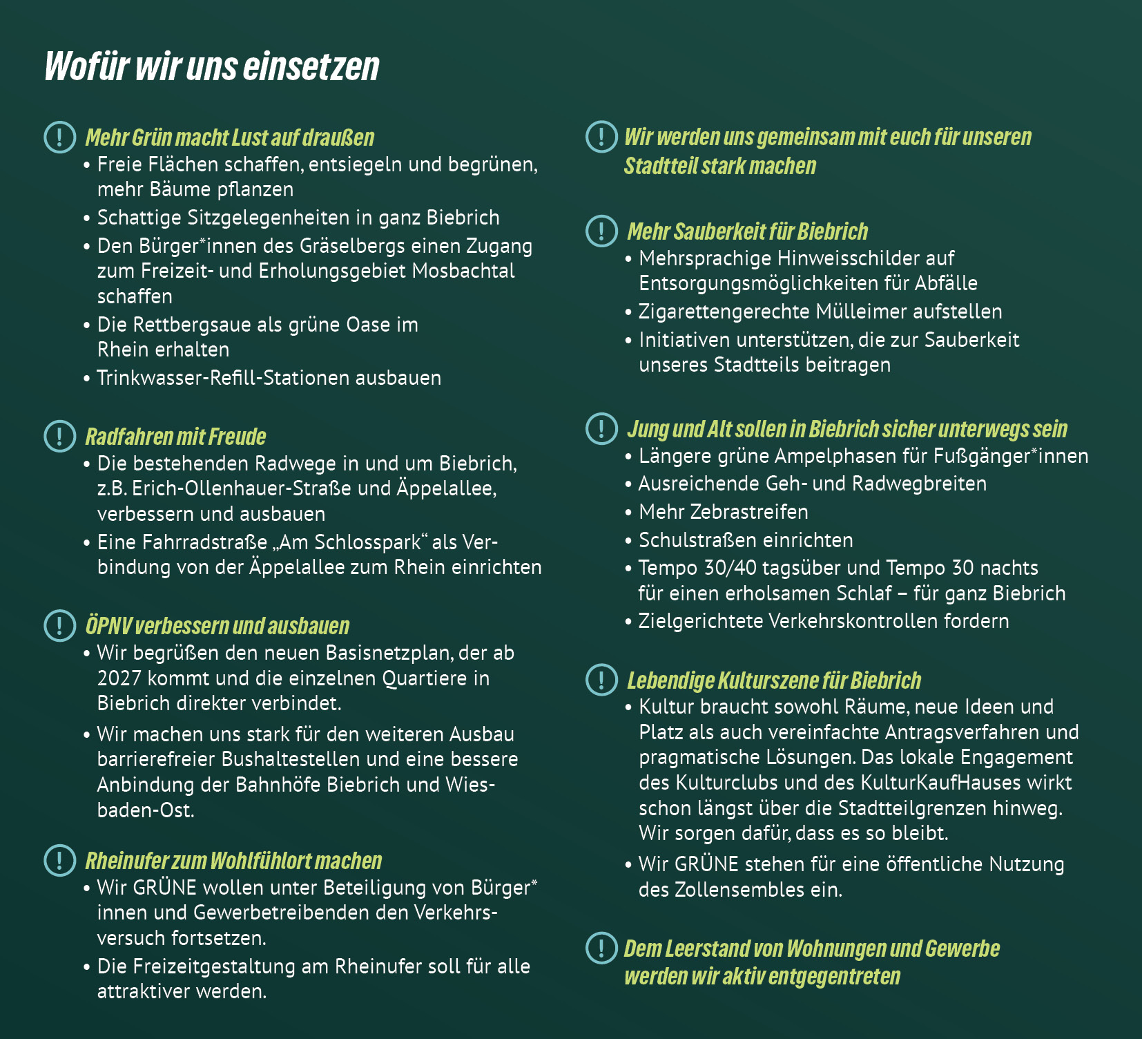 Mit deiner Stimme für uns GRÜNE entscheidest du dich für eine Politik in Wiesbaden, die mutig nach vorne blickt: ökologisch, sozial, vielfältig, digital und innovativ!