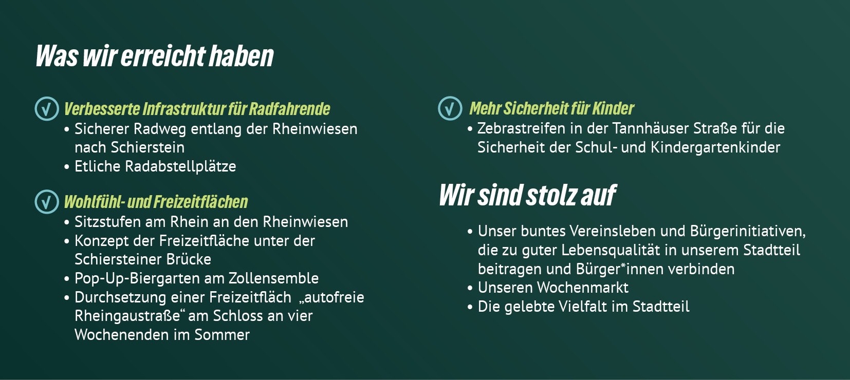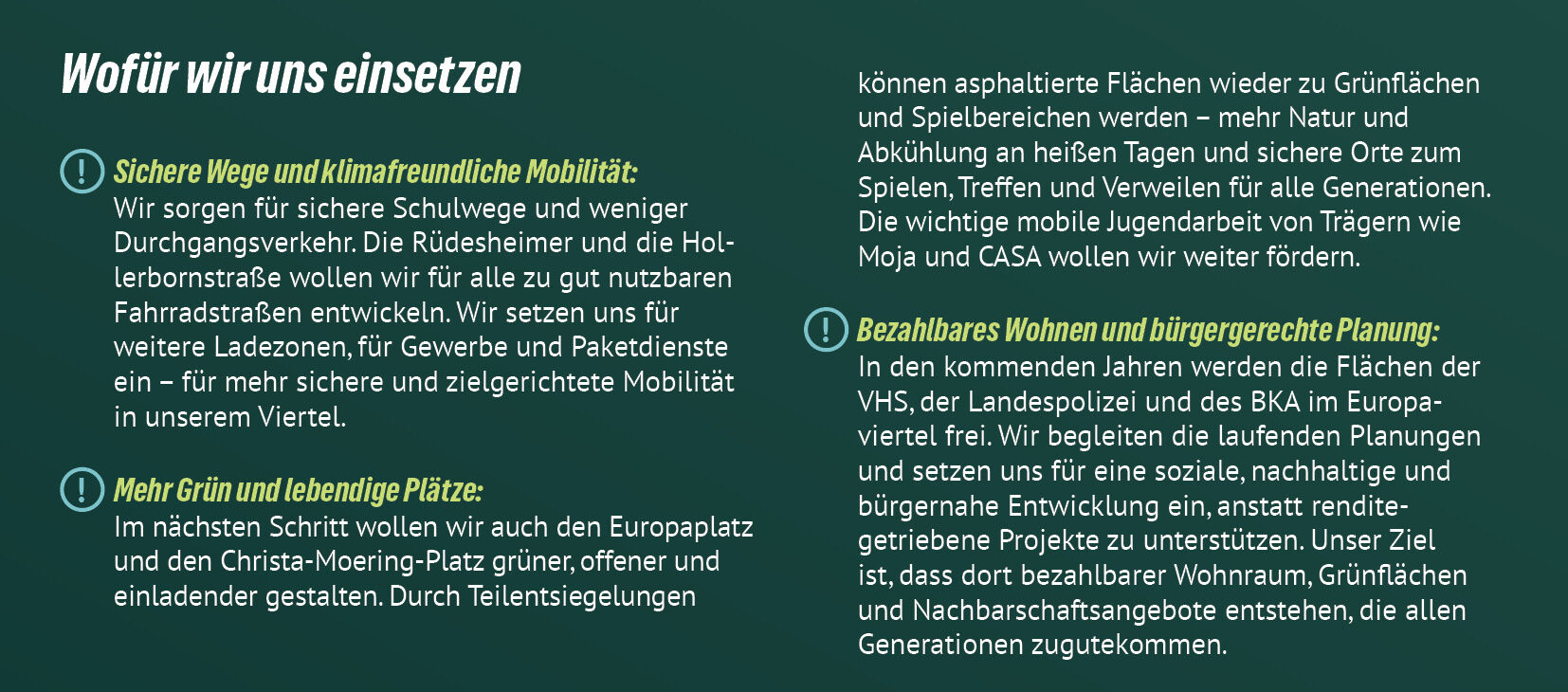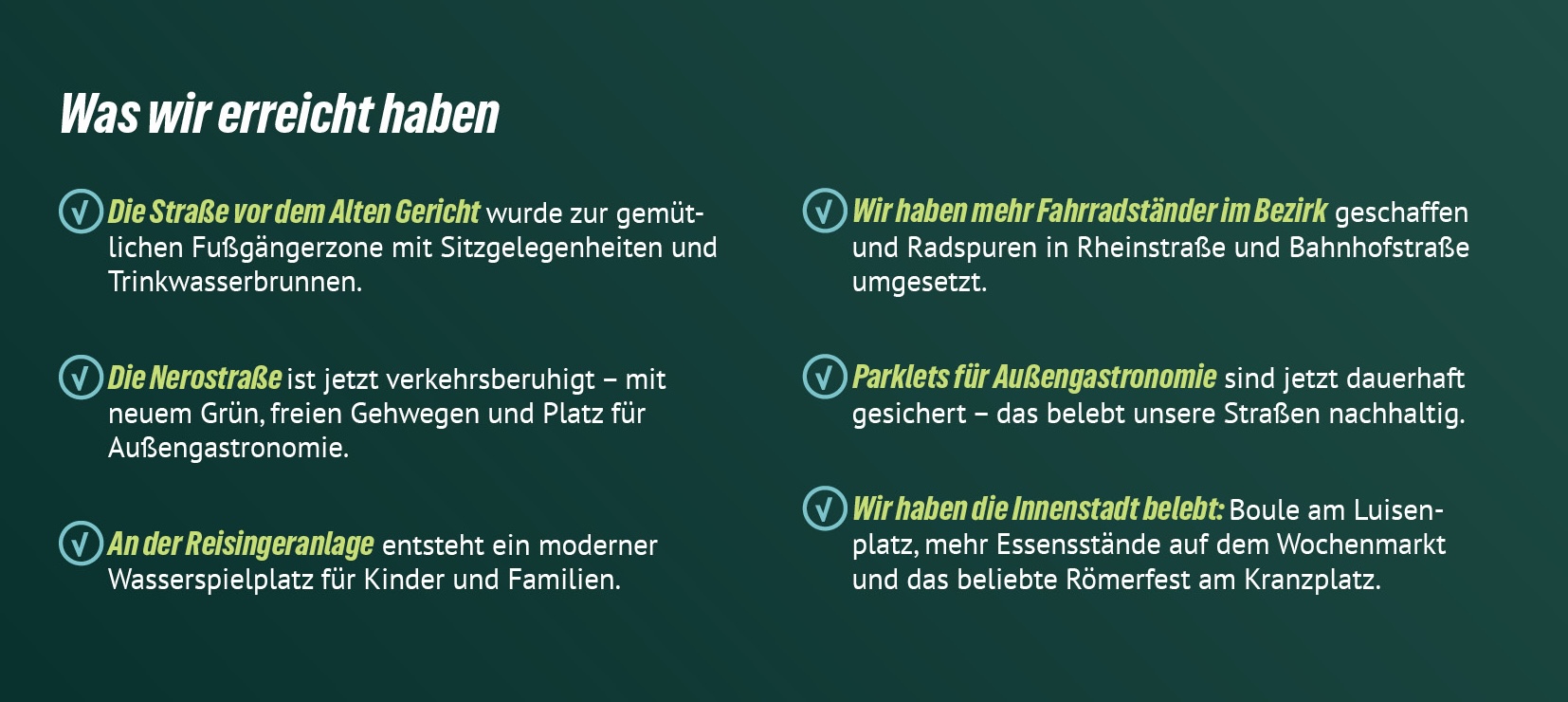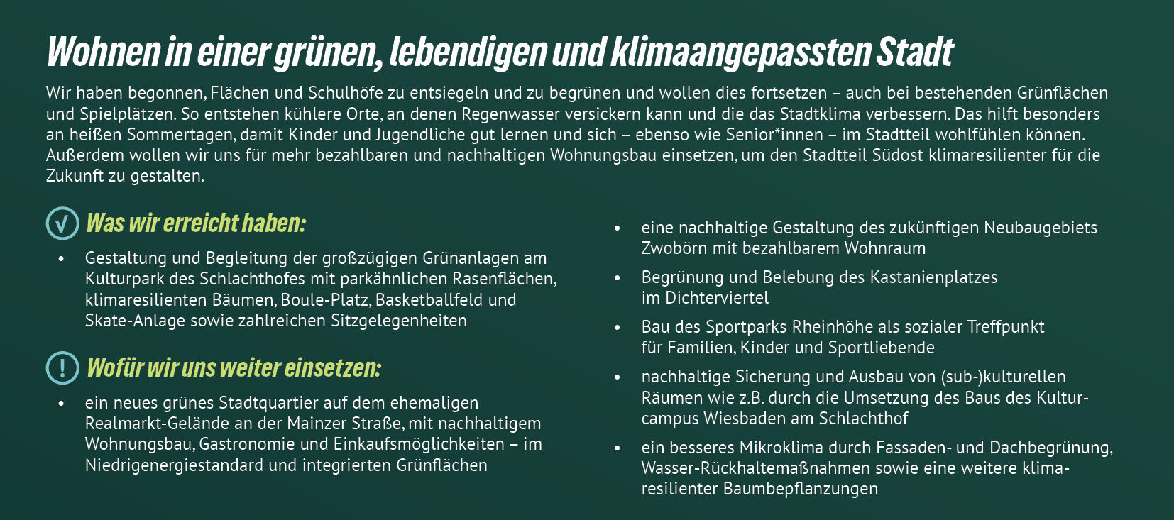 Kurz gesagt: Kommunalpolitik betrifft dein tägliches Leben – von bezahlbarem Wohnraum, guten Schulen und Kitas über sichere und klimafreundliche Mobilität bis hin zu lebenswerten Stadtteilen und mehr Teilhabe für alle. Jede Entscheidung im Rathaus prägt, wie wir in Wiesbaden zusammenleben – heute und morgen.